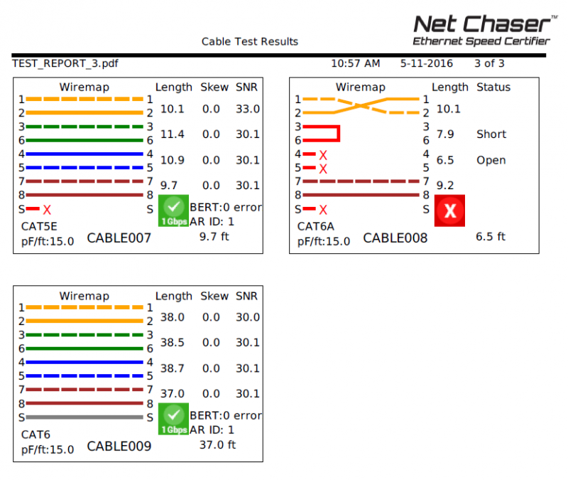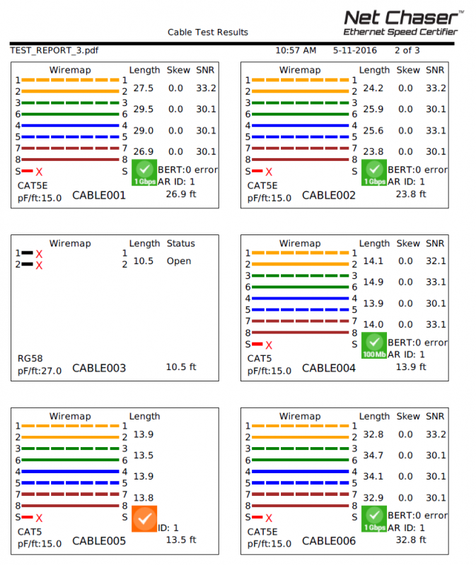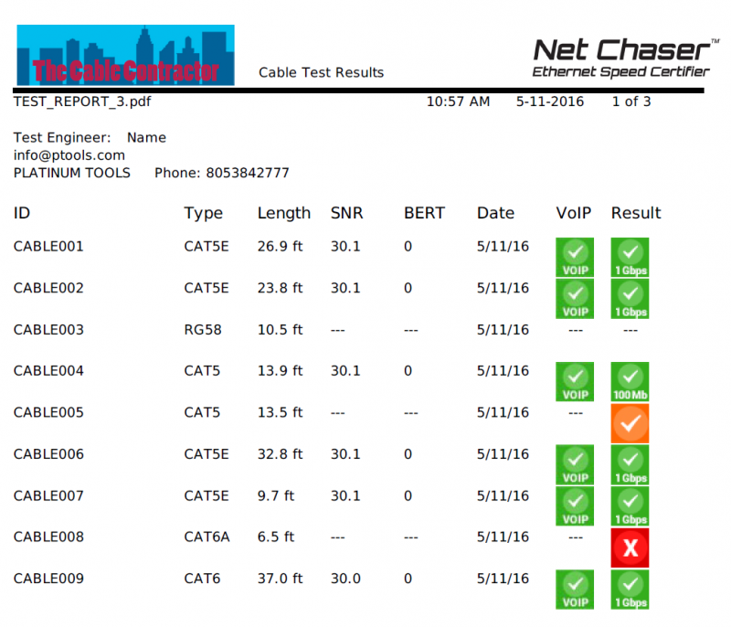 The TNC950AR can also handle other cable testing such as Bit Error Rate Testing, Signal to Noise Ratio, and SKEW. It is easy to forget but this tester can handle the basic tests including but not limited to, tone generation, network and coax id, and lengths to opens / shorts. On the Network Testing front the Platinum Tools TNC950AR can do Port and VLAN Discovery, Traceroute, IPV4 Support, and detects PoE per IEEE 802.3af/at. All information is stored and ready to be exported to generate reports for the end user. Below is an image of a sample cable test report generated from the TNC950AR. Platinum Tools also has a nice video that showcases these features and shows how easy this unit is to operate. The video can be found by clicking the following link.