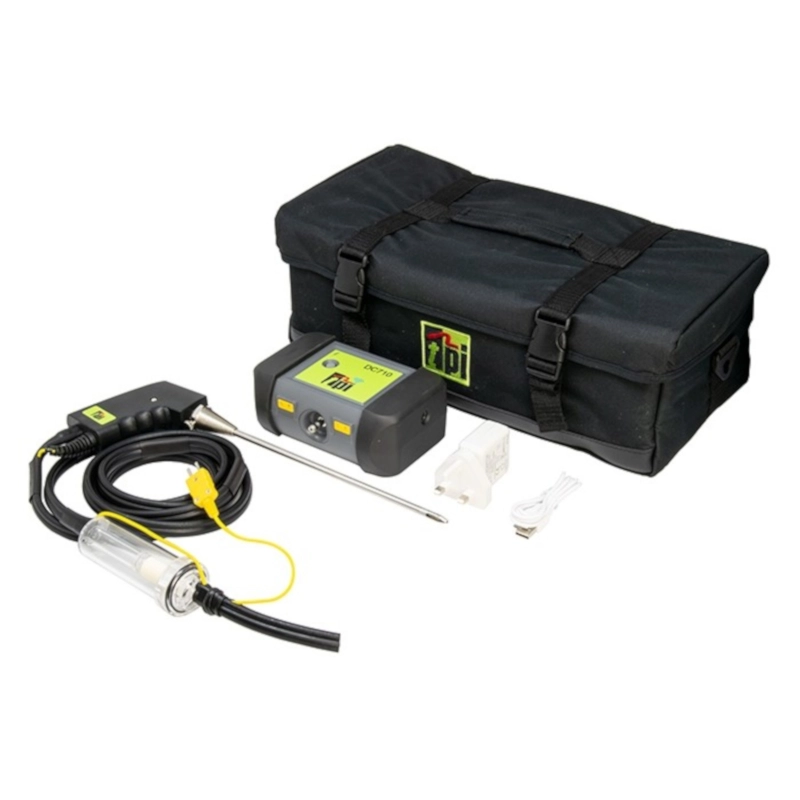 The TPI DC710C1 kit includes the DC710 combustion gas analyzer, flue gas probe with temperature, USB charger, rechargeable battery, and carrying case.