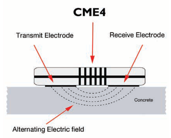 Non-destructive test measurements are done by sending an electric current into the concrete from the transmitting pins that penetrate up to ¾” into the surface of the concrete. The receiving electrodes complete the circuit and the detected strength of the current can be converted in a moisture content value. The strength of the signal varies with the amount of moisture in the concrete.