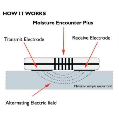 The Tramex MEP non-invasive moisture meter instead uses a low level electrical signal to take moisture readings that leaves all your working surfaces intact. It does this by have both transmitting and receiving electrodes that send out a low frequency electrical field that detects changes in impedance causes by moisture interference and then registers that value as a moisture percentage on the dial. Pretty neat. This contact method also provides for maximum sensitivity.